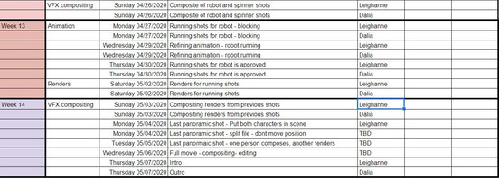 Posing and timing are the key techniques to Blocking animation (Clark, 2004, p.1) which requires the use of stepped curves, not spline. This enables the timeline to remain clean and sent for review. It also makes critiquing easier and more effective to the workflow. After this is approved, all other 10 principles can be achieved through using curves, adding weight and follow through. Even if our characters are robots, we need to establish personality in them. Hence, once the rigging is done and possibly approved I will get to blocking the animations for my shots so as to get them approved asap and have my shots ready for submission. In order to ensure that we complete the project on time, I put together a new "Crucial Weeks" Production plan for my team and I to follow. If any of the new deadlines are missed or delayed, it will heavily cost our production. See below of the new Production plan created on google sheets.