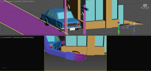 Screenshots of the car I modeled in the scenes in the 3D animatic. Everything out of frame has been deleted for optimization.